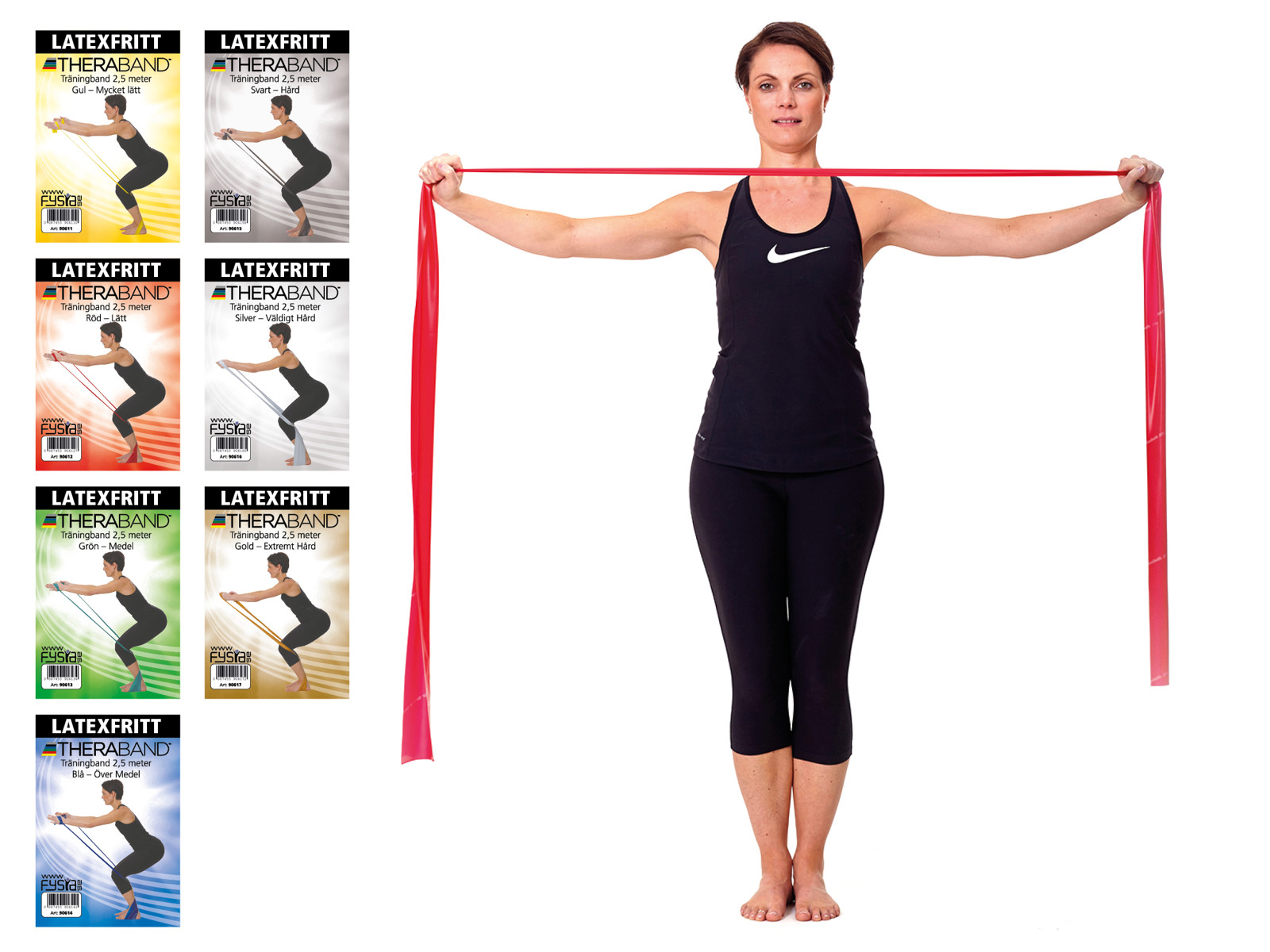 TheraBands elastiska träningsband har förmågan att förlänga sig proportionellt, upp till 500 % av sin längd. När man tränar och rehabiliterar med elastiska band arbetar man vanligtvis med en förlängning av träningsbandet på mellan 0 % till 200 %. FYSIA och har valt att marknadsföra alla 7 färger/motstånd av detta latexfria elastiska träningsband. Träningsbandet är indelat i färgkoder. Färgkoderna anger de elastiska bandets motstånd och skillnaden är 25 % mellan varje nivå/färg. De olika nivåerna skapar möjligheten för en progressiv träning, där du tydligt kan se och mäta dina framsteg.